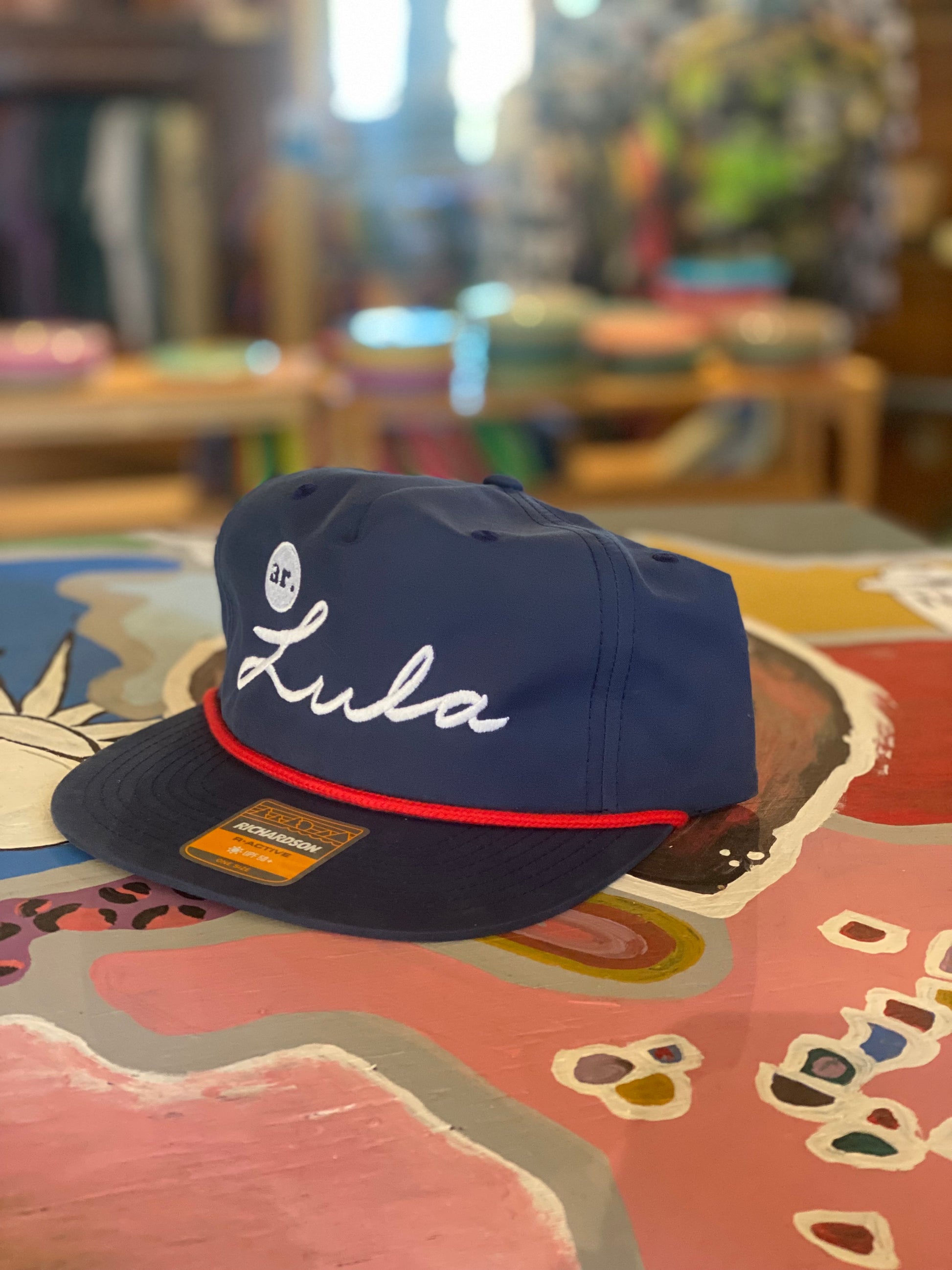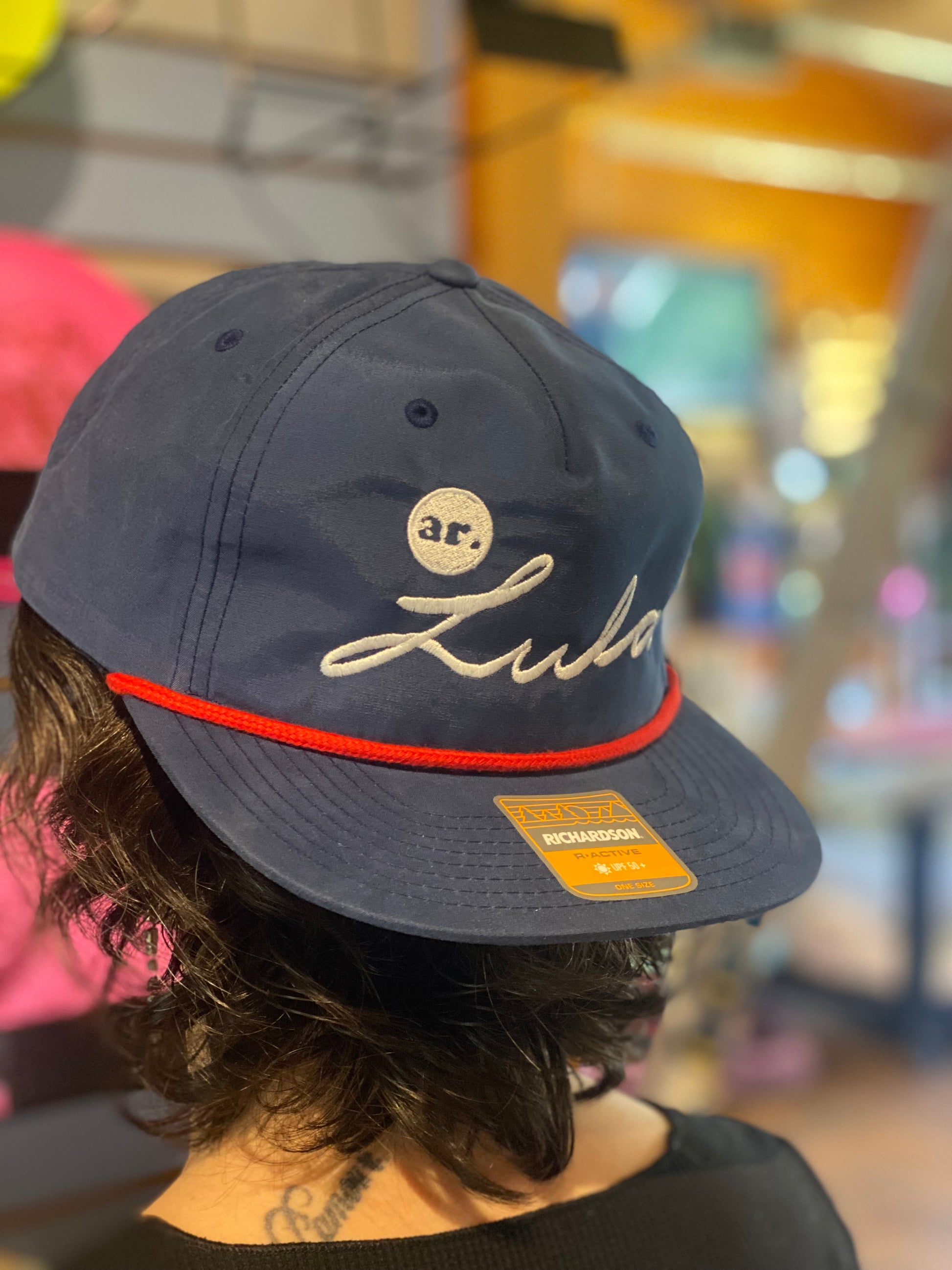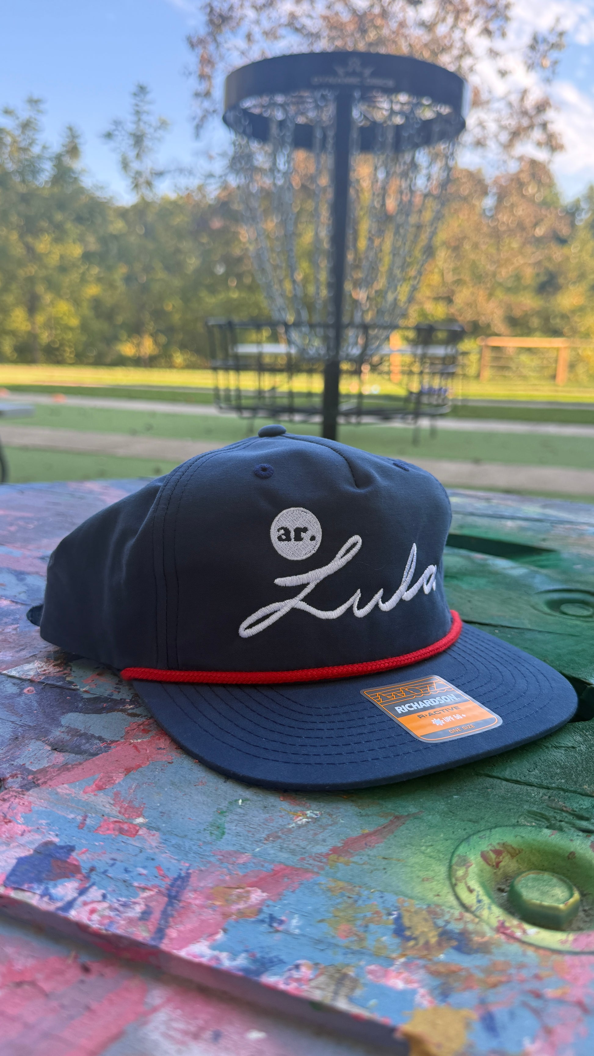 The Lula Rope Hat blends classic style with disc golf culture. Featuring a navy crown, white embroidered “ar. Lula” script logo, and a bold red rope accent across the brim, this hat is perfect for repping Another Round Lula on and off the course